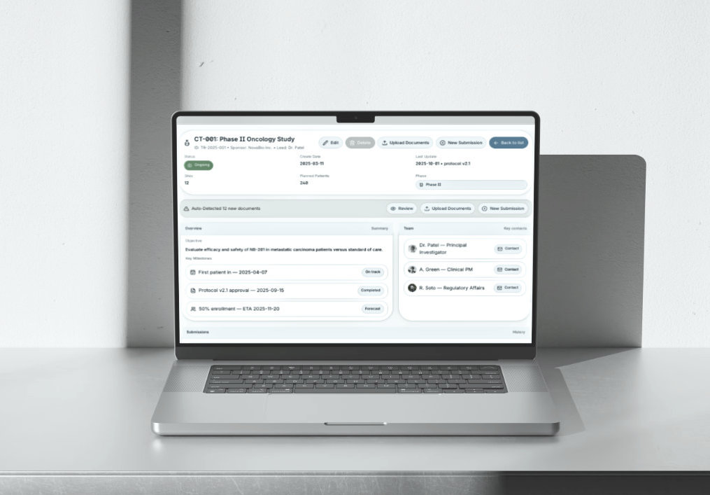 - Protocol & Version Control | Tracking current and historical clinical trial protocols and modifications.